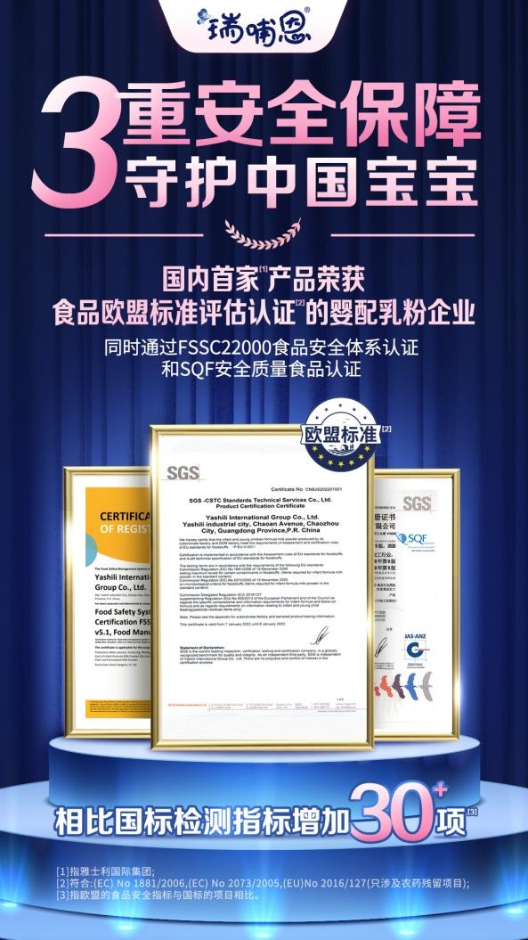 以创新为动力,以品质为根基,承载守护国民健康的责任初心,为了更好地提升产品品质,蒙牛瑞哺恩对标全球最严欧盟标准开启覆盖奶源、生产、加工全方位的质量升级,交出国内4家工厂顺利拿下国际权威认证机构SGS授予的欧盟食品标准认证的好成绩,更成为国内首款荣获食品欧盟标准评估认证的婴配乳粉产品,持续保持行业质量标杆地位。
