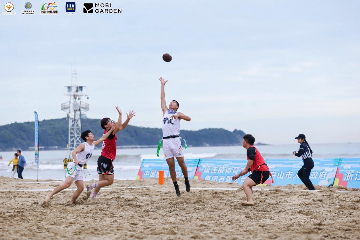 朱家尖的金色沙滩上,沙滩腰旗橄榄球赛事点燃了团队协作的热潮。这项融合了技巧、速度与团队协作的潮流运动,吸引了500余名运动员参与角逐。