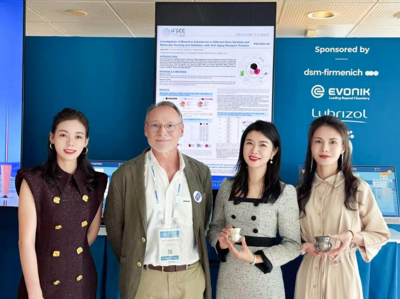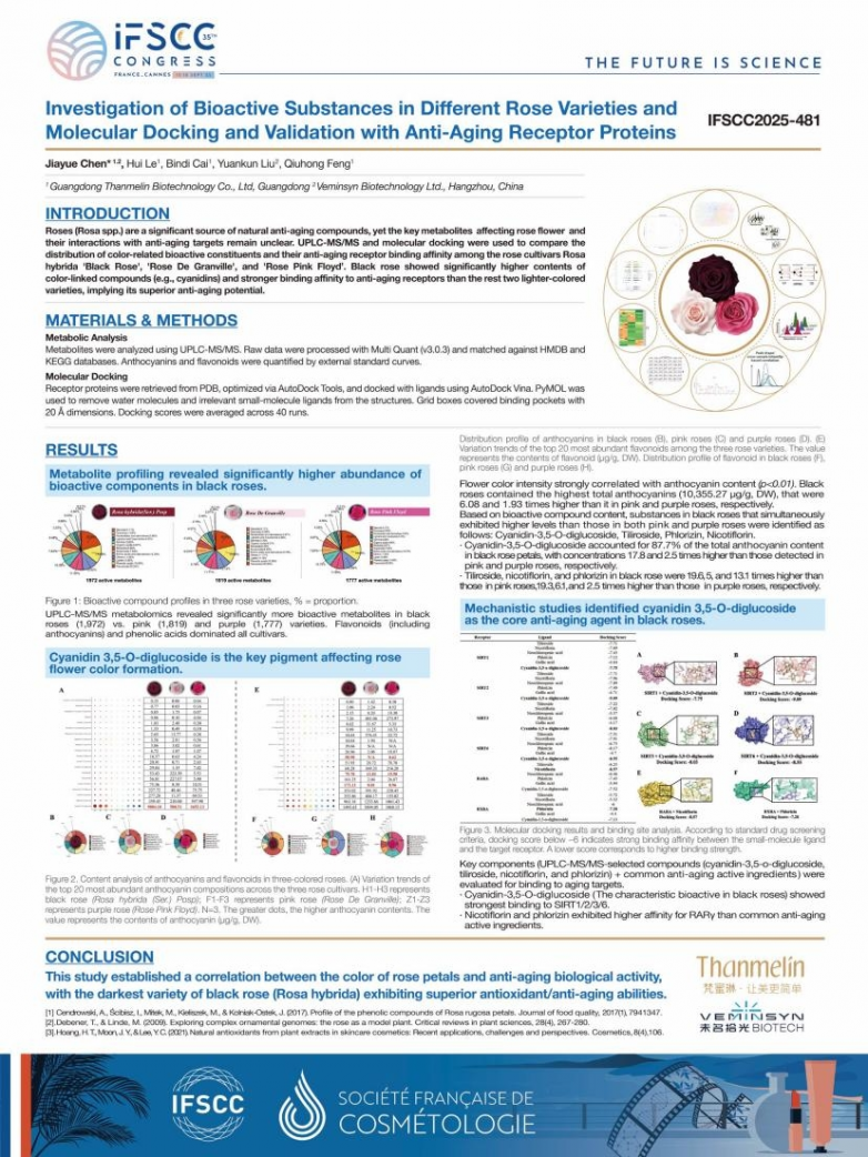 今年,梵蜜琳再携黑玫瑰抗衰取得的新突破亮相IFSCC大会。青眼了解到,其科技新成果《Investigation of Bioactive Substances in Different Rose Varieties and Molecular Docking and Validation with Anti-Aging Receptor Proteins》(不同玫瑰品种生物活性物质的研究以及与抗衰受体蛋⽩的分子对接和验证)获本届IFSCC大会收录。这意味着,梵蜜琳在黑玫瑰抗衰上的持续深耕再获IFSCC大会肯定。