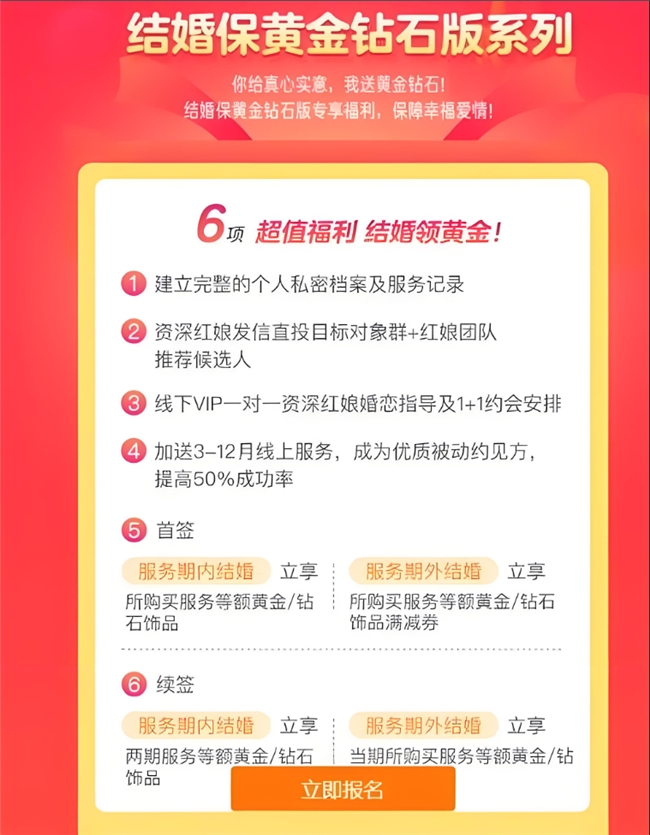值得一提的是,世纪佳缘的服务视野早已超越恋爱阶段的牵线搭桥,将关怀延伸至婚姻生活的全周期。其创新推出的“结婚保”服务设定了明确的服务承诺机制:若用户在服务期内成功步入婚姻,平台将赠送黄金或钻石作为祝福礼;若未能达成目标,亦可享费用返还或后续服务优惠。这一设计不仅传递了对用户幸福的真诚祝愿,更彰显了世纪佳缘对自身服务成效的充分信心与责任担当。