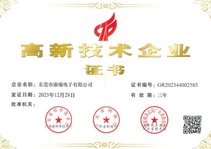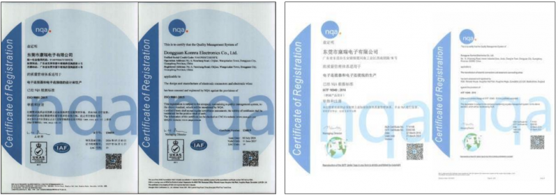 在长期发展过程中,康瑞电子先后荣获国家高新技术企业、广东省专精特新中小企业等资质,并被评为东莞市优秀企业、网商会会员单位、热心公益先进单位及商务诚信企业。同时,公司建立了完善的质量与管理体系,并通过ISO9001质量管理体系认证、ISO14001环境管理体系认证、IATF16949汽车行业质量体系认证、ISO45001:2018职业健康安全管理体系认证、ISO13485医疗器械质量体系认证及IPC620线束工艺标准认证等多项国际标准认证。