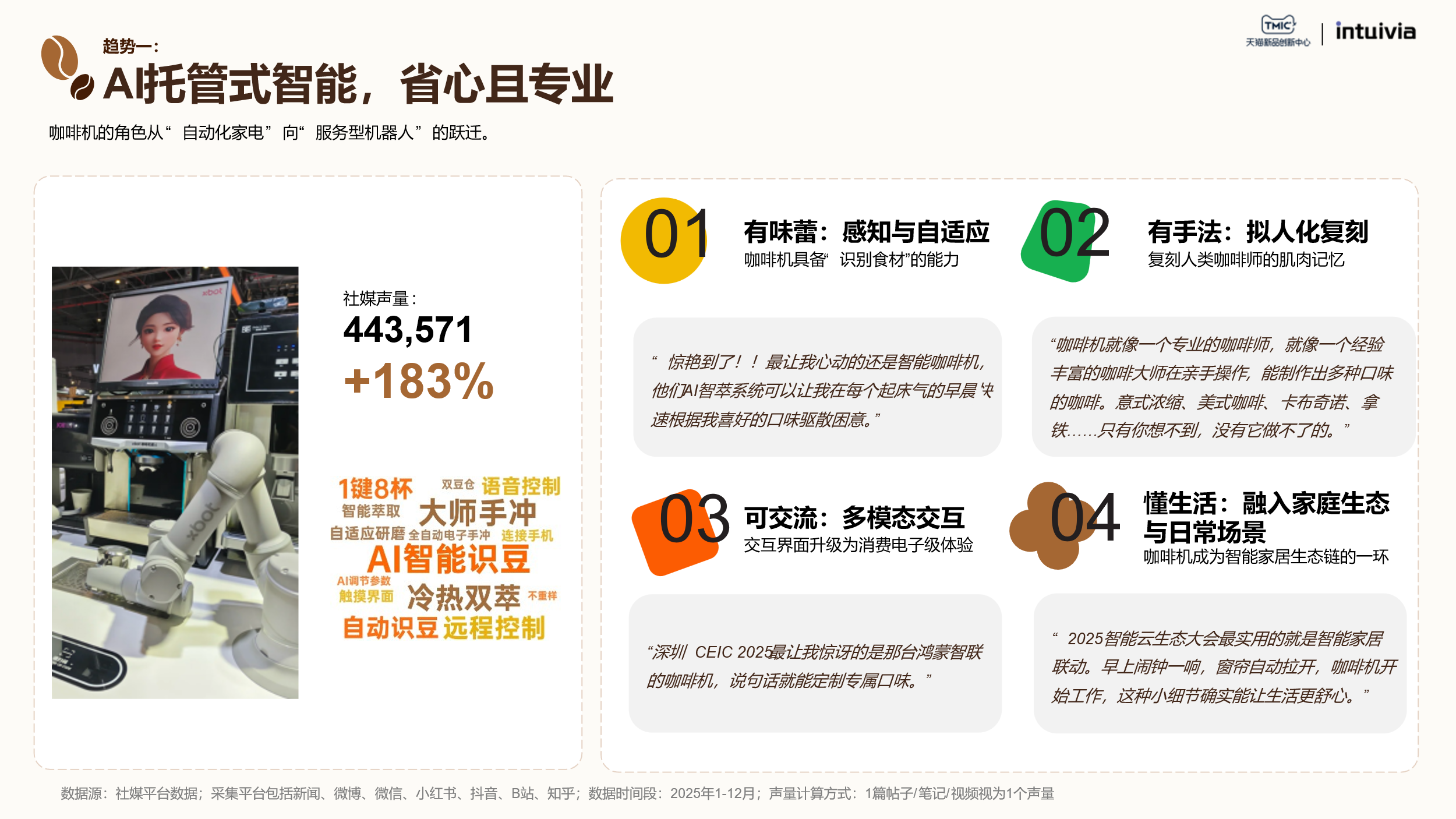 高效型社交尝鲜新青年是国产创新品牌的主力军。他们的决策逻辑是性价比优先,其次是颜值和易用性。咖啡不仅是日常提神饮品,更是社交货币。他们偏好制冰、冷奶泡、双豆仓等功能模块,追求的是日常生活节奏中的小确幸和生活里的一点甜。