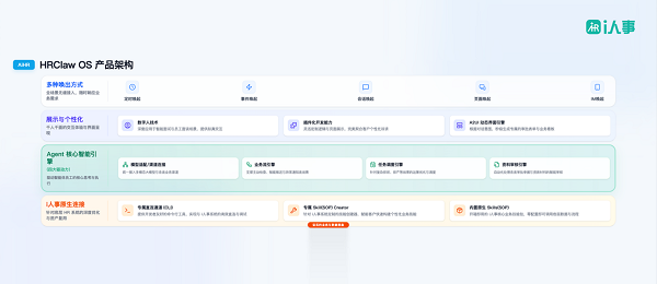 HRClaw的底气来自四层核心架构:原生连接层自带技能包,扎根核心人事系统;核心引擎层包含业务流、任务调度、资料审核引擎;展示与个性化层通过数字人和A2UI技术实现千企千面;多种唤出方式支持企微、钉钉、飞书。