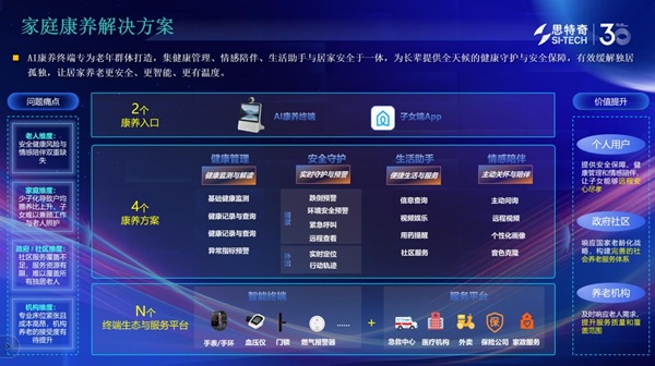 依托AI生态服务平台的强大技术底座,思特奇将AI能力深度下沉至广电民生服务场景,推出专为老年群体打造的AI康养智能终端,填补广电智慧养老服务空白,让数智红利真正惠及千家万户。